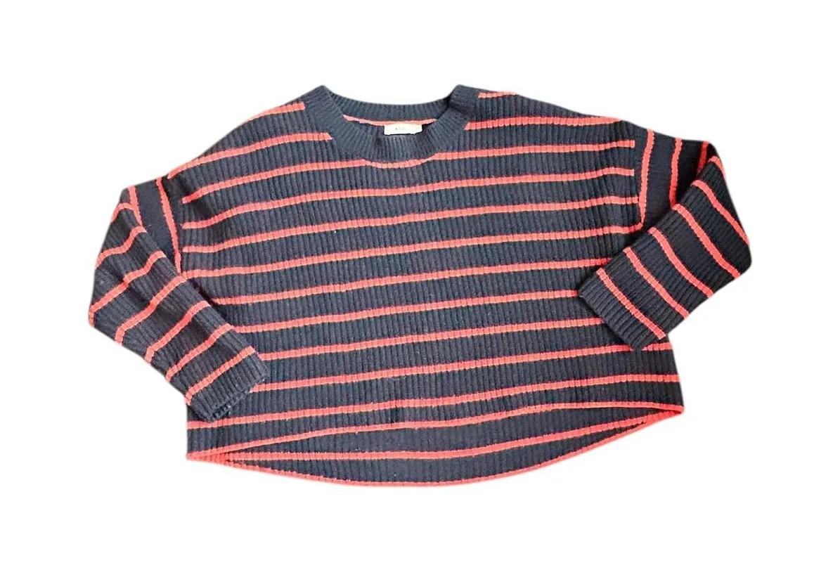 A.L.C. navy and red striped crew neck sweater. This knit top features a classic horizontal stripe pattern and a relaxed fit. The long sleeves and comfortable knit construction make it a versatile layering piece. Measurements: • Chest (pit to pit): 25 in • Length (shoulder to hem): 21 in Style: Pullover Department: Women Material: Wool Neckline: Crew Neck Sleeve Length: Long Sleeve Type: Sweater Features: Oversized Pattern: Striped Fabric Type: Knit Knit Style: Waffle-Knit Season: Fall, Spring Fit: Relaxed Occasion: Casual Unit Type: Unit Keywords: ALC sweater, striped knit, crew neck top, long sleeve, navy orange, casual, designer, wool blend, fall fashion, winter wear, weekend style Ships fast from pet & smoke free home. offers welcome! Please review all photos.