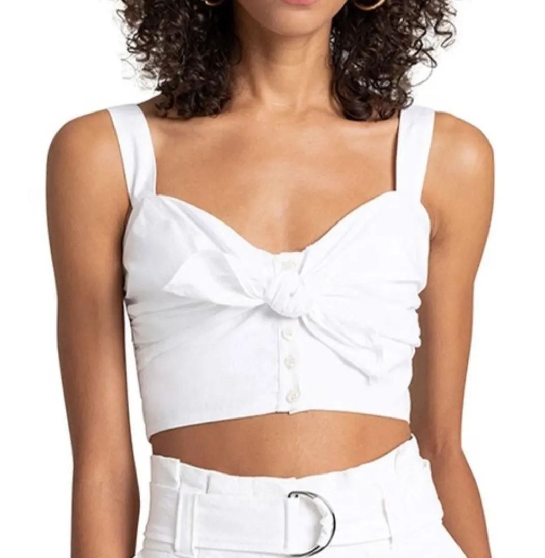 Brand: A.L.C. Flawed, front seam came off see last picture!!!! Style: Women's cropped tank top with a sweetheart neckline, wide straps, and a dramatic front tie bow detail. Color: White Material: 100% cotton. Size: 2 (women's regular fit). Details: Knotted front bow over a partial button-front placket, solid fabric, slim fit, strappy shoulders, ruched bust, and a smocked elastic back panel for comfortable stretch. Tags: Original A.L.C. hangtags attached with MSRP $195.00. Codes: RN 130801; CA 30885; Style code S-1903 5TOPS00556; UPC: 192148070244.