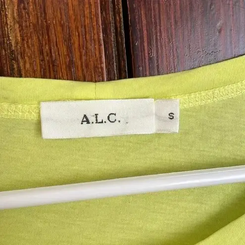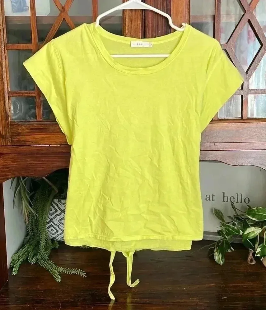 Radiant charm unfolds with this vibrant neon yellow A.L.C. T-shirt, a playful twist on a classic silhouette. The eye-catching hue instantly brightens your look, while the relaxed fit ensures all-day comfort. A unique tie-back detail adds a touch of whimsy and allows for a customized, flattering fit. The short sleeves offer effortless style, making it a versatile piece for your wardrobe. Envision yourself strolling through a sun-drenched farmers market, enjoying a casual brunch with friends, or adding a pop of color to your everyday errands. There is a tiny stain on the sleeve I have not tried to remove. Keywords: A.L.C., T-shirt, Tie Back, Neon Yellow, Short Sleeve, Casual Top, Womens, Size S, Summer, Bright, Comfortable, Fashion, Stylish