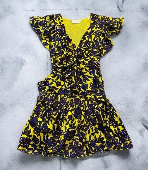 ALC Viera twist front floral print ruffle sleeve floral print hammered 100% silk mini dress in yellow and purple. Hard to find in this color way! Excellent condition! Measures approx 16” from pit to pit laying flat and 34” from shoulder to bottom hem