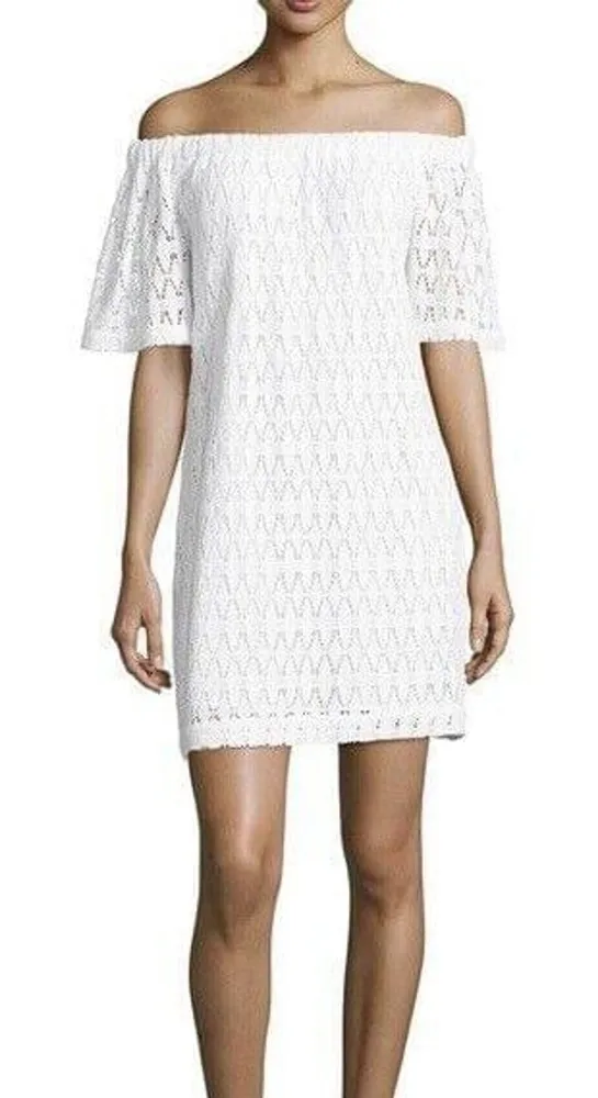 Beautiful A.L.C. Bolen dress in crisp white cotton with an off-the-shoulder neckline and intricate crochet lace detailing. Features an elasticized top edge for a secure, comfortable fit, a fully lined interior, and a flattering A-line silhouette. Perfect for bridal events, vacations, and minimalist feminine styling. Details • A.L.C. Bolen Dress • Off-the-shoulder neckline • Crochet lace detailing • 100% cotton • Fully lined • A-line silhouette • White / ivory tone • Size 2 Condition: Excellent SEO Keywords: alc dress, white off shoulder dress, crochet lace dress, bridal shower dress, rehearsal dinner dress, bachelorette outfit, summer white dress, vacation dress, feminine lace dress, designer mini dress, cotton lace dress