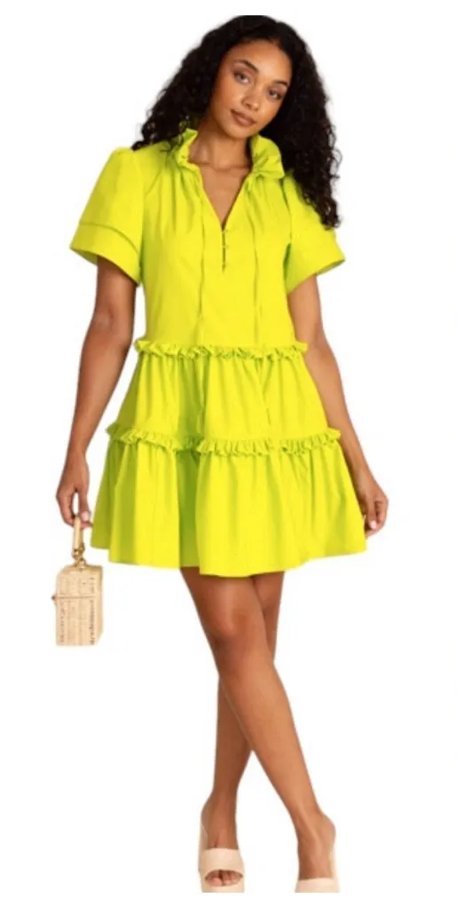 NWT Aldean Adair Hallie Dress in Citrus, Size Small. The beautiful short sleeve mini dress features a ruffled collar and v-neck with beaded tassel ties. 100% polyester. This is in new condition with tags still attached, and no flaws. This dress runs on the larger side. Please see measurements below. Pit to pit 19.5” Waist 18” Length 35”