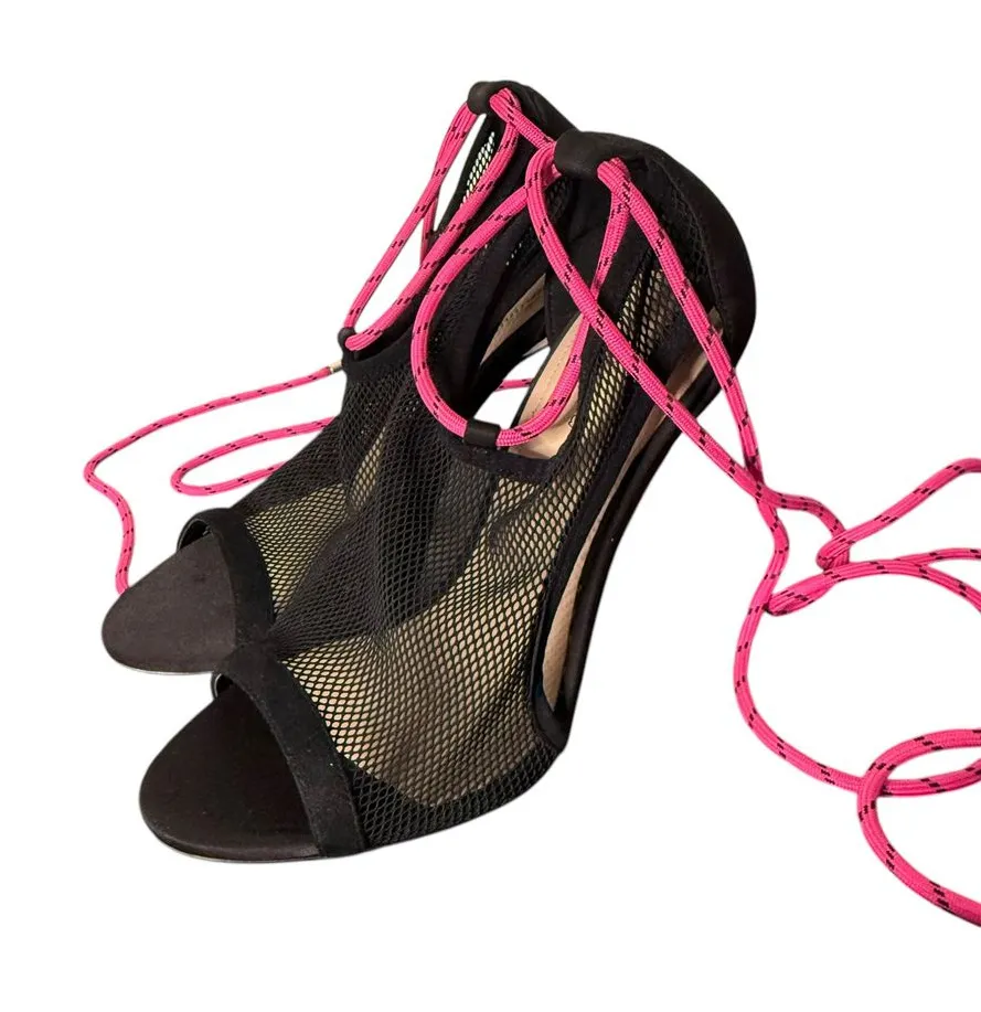 ALDO Lace Up High Heels Size 7 Black Mesh Open Toe Clear Block Heel CARDI Pre Owned. In Great Sha... Show more
