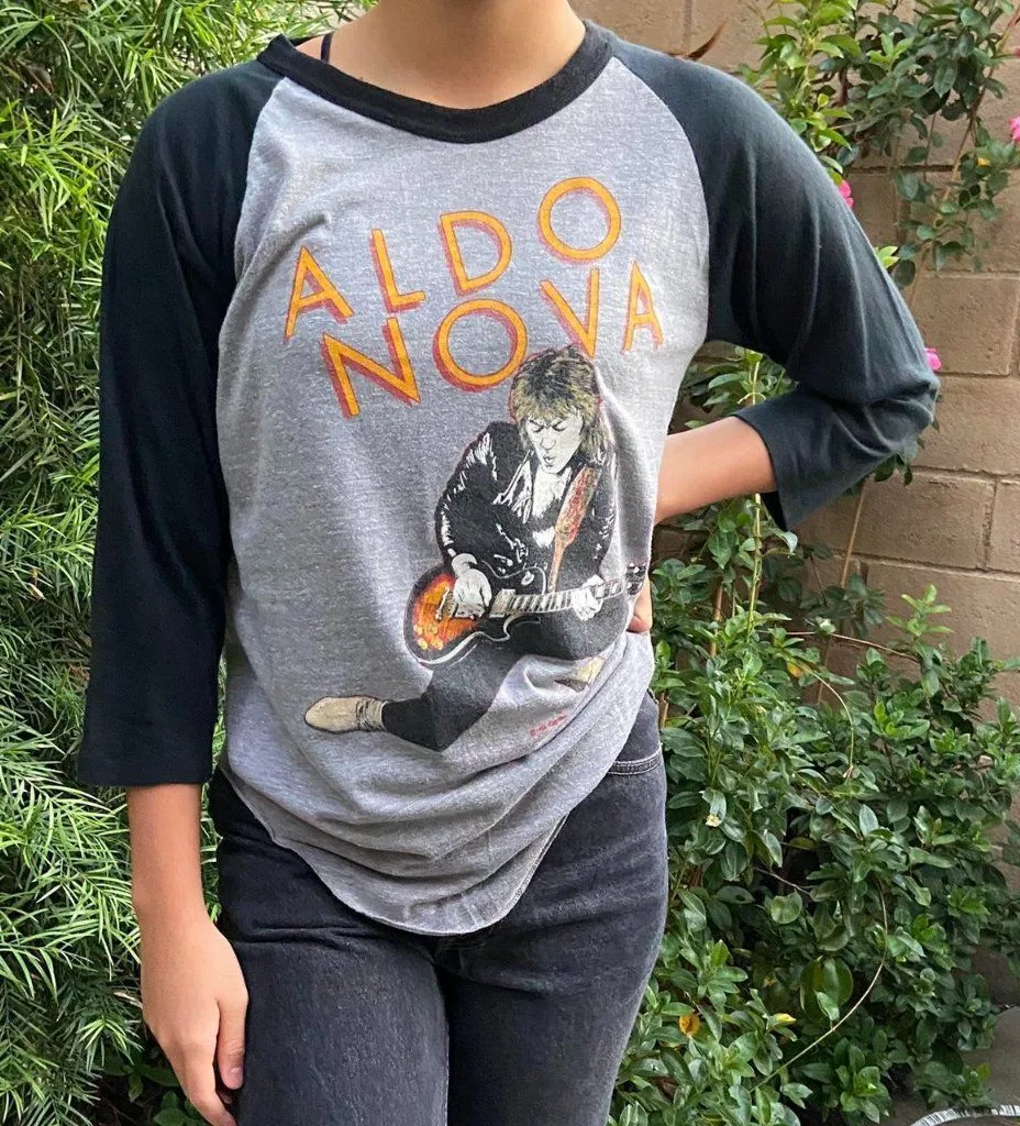 Aldo Nova 80's Rock Gray Heather & Black 3/4 sleeve crewneck T-shirt. soft hand feel knit fabric with nicely worn down washed look. bold large colorful Art at front and back body. Original Vintage! relaxed Tee fit!✨ size M 28" top to bottom. 18 1/2" under arm. Model- Height:5’5”, Size: XS-S DM me with any questions🌟 Next day shipping❣️