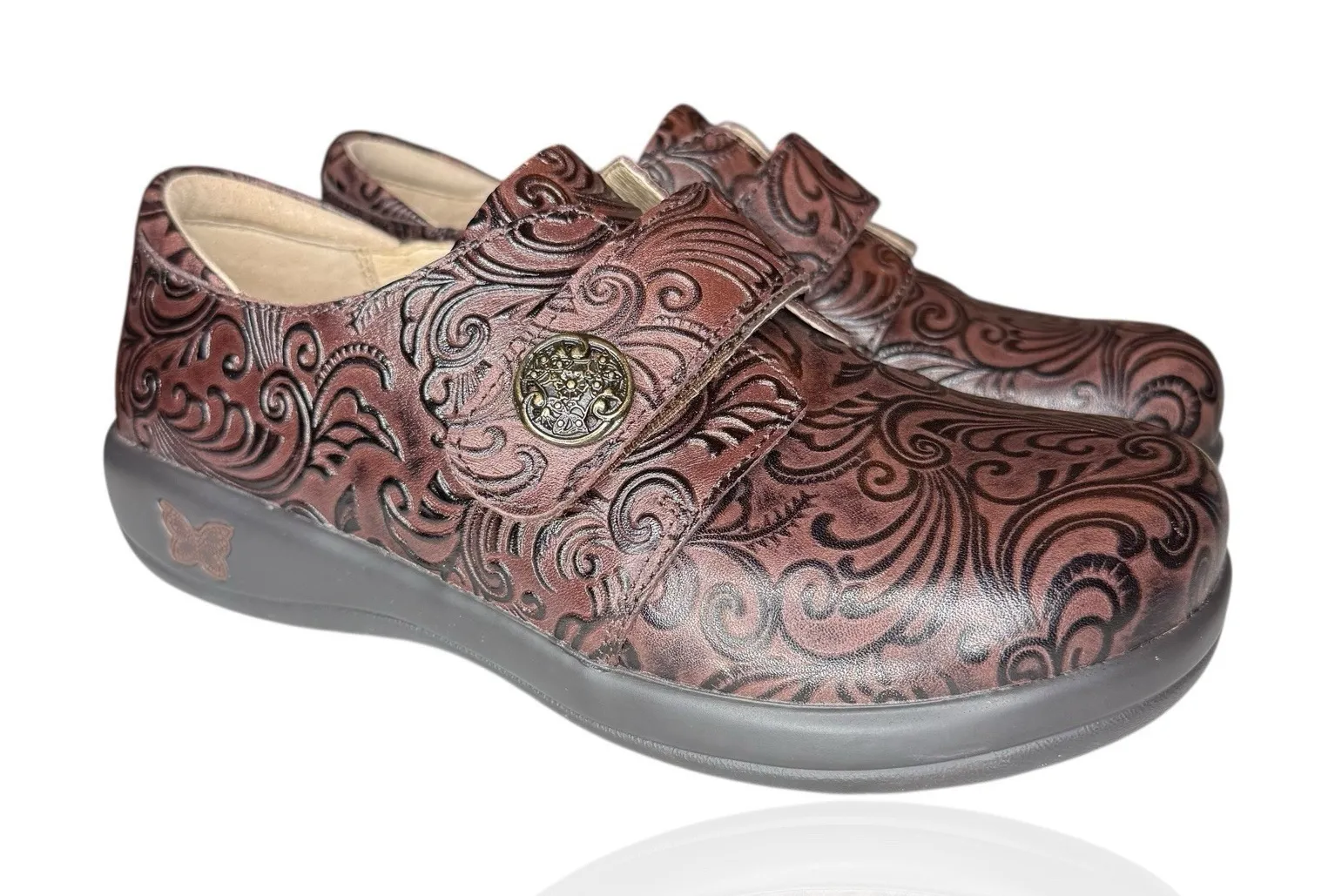 Alegria Joleen professional comfort shoes in a rich brown embossed leather with an elegant scroll pattern. These feature a supportive Mary Jane style with an adjustable strap and decorative button, designed for all day comfort and stability. Built with Alegria's signature cushioned footbed and slip resistant outsole, making them ideal for work, healthcare, or long standing shifts. Excellent preowned condition. Ships within 24 hours. Keywords alegria joleen women professional shoe mary jane embossed leather brown comfort nurse work healthcare slip resistant cushioned footbed adjustable strap supportive walking standing shoes size 7 size 7.5 euro 37 career workwear medical hospitality comfort footwear ergonomic arch support pc lite