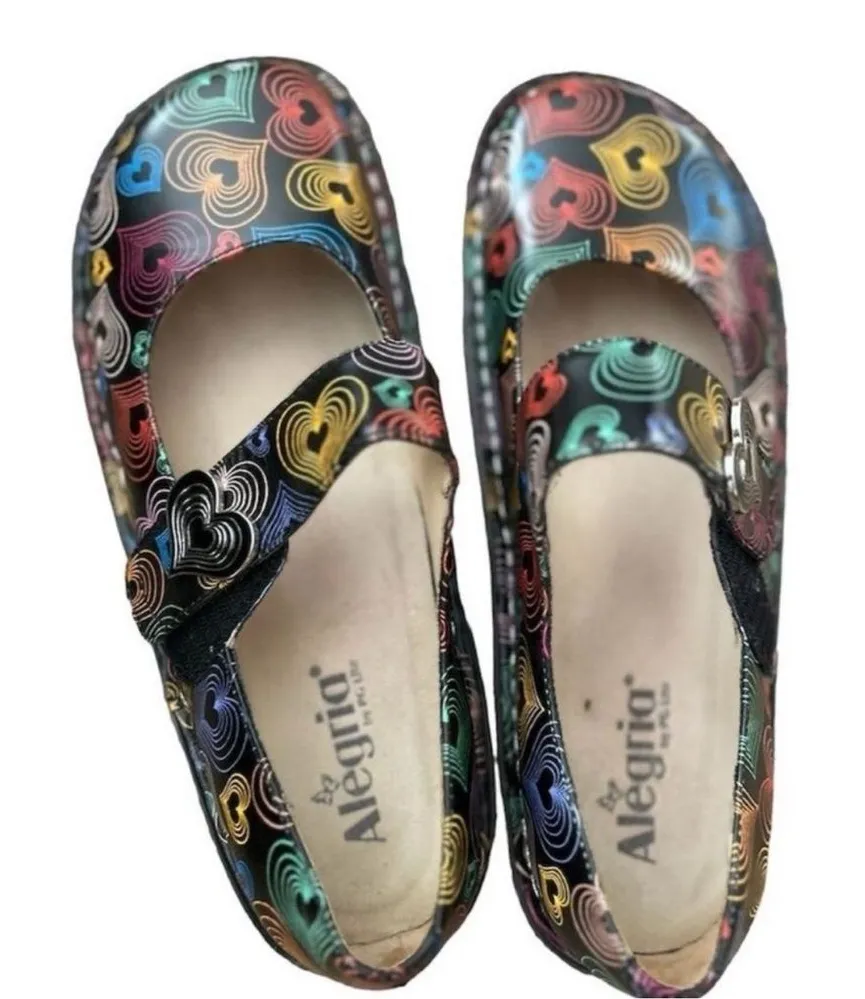 The Alegria Mary Jane Flats in multicolor are designed for women, featuring a heart pattern and a synthetic upper material. These flats come in EU size 41, with a convenient hook and loop closure. They are equipped with a slip-resistant sole and a comfort footbed, making them ideal for casual occasions. These pre-owned flats are perfect for everyday wear. Keywords: Alegria, Mary Jane, flats, multicolor, women's shoes, synthetic, heart pattern, casual, slip-resistant, comfort, hook and loop, pre-owned, EU 41. Brand: Alegria Style: Mary Jane Flats Color: Multicolor Department: Women Type: Flat Upper material: Synthetic Eu shoe size: 41 Pattern: Heart Closure: Hook & Loop Features: Slip-resistant sole, Comfort footbed Occasion: Casual