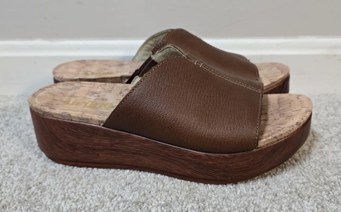 The Alegria Triniti Brown Faux Wood Platform Wedge Slip-On Sandals in size 39 (US 8.5/9) are a styli... Show more