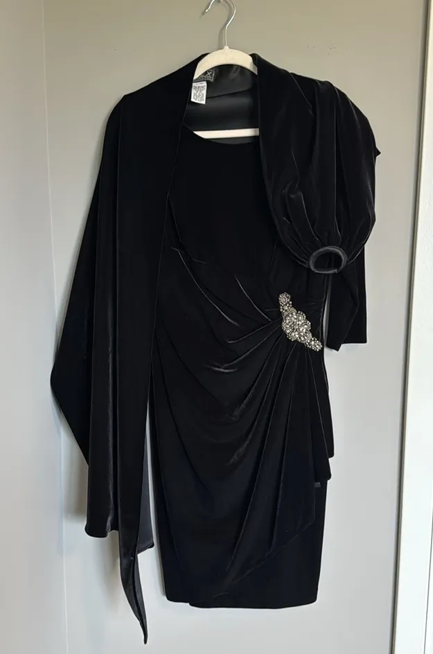 Timeless and elegant Alex Evenings two-piece set — includes a black velvet dress and matching wrap. The dress features soft stretch velvet fabric, gentle draping, and an exquisite beaded accent at the waist for a flattering silhouette. The coordinating wrap adds extra polish and warmth for formal occasions. ✨ Details: • Size: 10 • Color: Deep black velvet • Fabric: 90% Polyester / 10% Spandex • Features: Beaded waist embellishment, matching wrap with ring detail, ¾-length sleeves 📏 Approximate Measurements (laying flat): • Bust (armpit to armpit): 18 inches (36” total circumference) • Waist: 14 inches (28” total circumference) • Length (shoulder to hem): 38.75 inches Measurements are approximate; taken flat without stretching the fabric. • Worn once for a wedding — excellent condition • Smoke-free home Perfect for weddings, formal events, holiday parties, or evening occasions. Classic 90’s Alex Evenings quality and craftsmanship — a true statement piece that never goes out of style.
