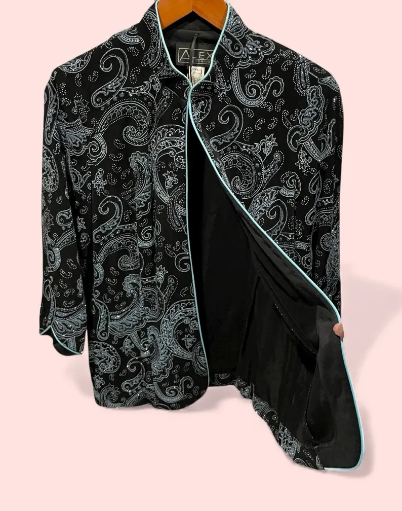 . Brand is Alex Evenings. Jersey knit. Flowy. Single hook front closure. 3/4 ruched sleeves. Mermaid fairy. Removable shoulder pads. GUC. Measurements taken laying flat are approximately: Pit to pit: 23” Length: 26” Sleeve: 19”