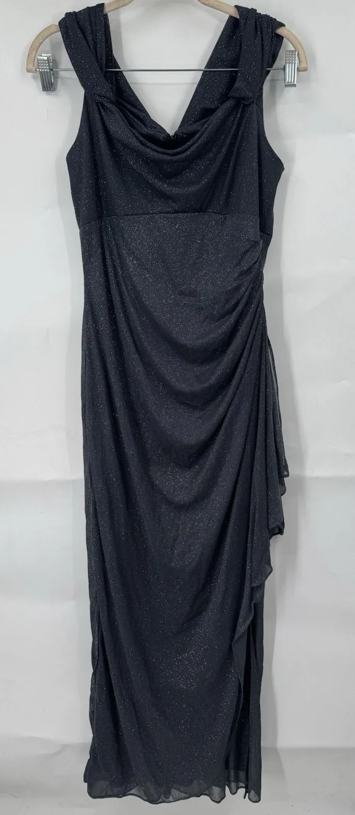 Glitter mesh fabrication Cowl neckline Cold shoulder cap sleeves Gentle side ruching detail Back zipper closure Polyester Hand wash Great pre owned condition. Size 6. All measurements are approximate: 18 inches pit to pit. 28 inch waist. 51 inch length.