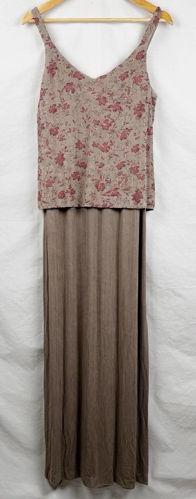 Elegant and timeless, this Alex Evenings dress features a sleeveless bodice with intricate metallic floral embroidery and a long flowy skirt, perfect for weddings, formal events, or special occasions. The shimmery thread detailing catches the light beautifully, while the soft stretch fabric ensures a comfortable and flattering fit. We ship out same business day and are happy to answer your questions!