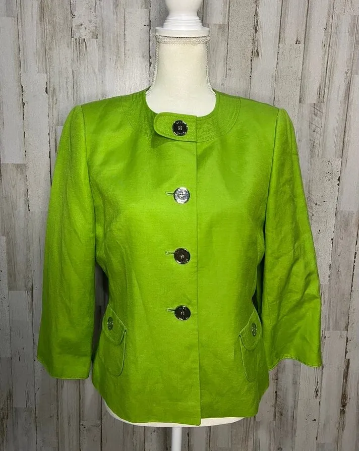 All orders ship next business day! Conditions: good used condition/No holes/No pilling/No fade Smoke free home! Please ask any questions! Thank you for Looking & Happy Shopping Brand: Alex Marie Type: Jacket Size: 6 Outer shell material: Unknown Style: Basic Jacket Department: Women Color: Green Features: Silver button front, Side pockets, 3/4 sleeve length Pattern: Solid Closure: Button Occasion: Casual Sleeve length: 3/4 Sleeve Pit to Pit: 19.5" Shoulder to Shoulder: 16" Length: 21" Keywords: Alex Marie jacket, women's green jacket, size 6 jacket, casual jacket, 3/4 sleeve jacket, silver button jacket, side pocket jacket, solid pattern jacket, button closure jacket, women's basic jacket, pre-owned women's jacket, green casual jacket, women's regular size jacket, stylish women's jacket, versatile women's jacket JACK179A JACK179