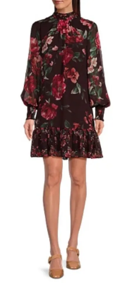 Chiffon fabrication Floral print Shift dress silhouette Mock neckline Long sleeves Smocked cuff B... Show more