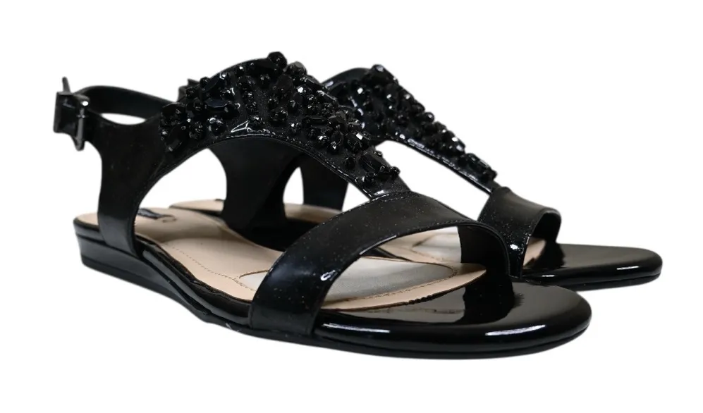 Alex Marie Women's 9 Black Enyah Leather Sandal New in box. Size 9 Medium. COLOR: Black Step out in style with these elegant black sandals. Perfect for any occasion, they offer both comfort and sophistication. Buckle closure Open toe Jewel embellished Leather upper Approx 3/4" heel