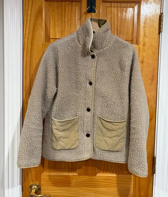 Cozy Alex Mill high-pile fleece jacket in a versatile beige/natural colorway. Designed with signature corduroy trim, contrast patch pockets, and a structured stand collar for an elevated, minimalist look. Soft, warm, and easy to layer — a timeless Alex Mill staple perfect for fall and winter wear. Great for everyday casual outfits, weekend layering, travel, and cozy capsule wardrobes. DETAILS Brand: Alex Mill Size: Small Color: Beige / Natural Material: 100% Polyester (high-pile fleece) Trim: Corduroy Style: Fleece jacket Closure: Button front Pockets: Front patch pockets CONDITION Pre-owned. One small faint mark on sleeve (shown in photos). Otherwise in very good condition with no holes, stains, or major flaws. Please review all photos carefully.