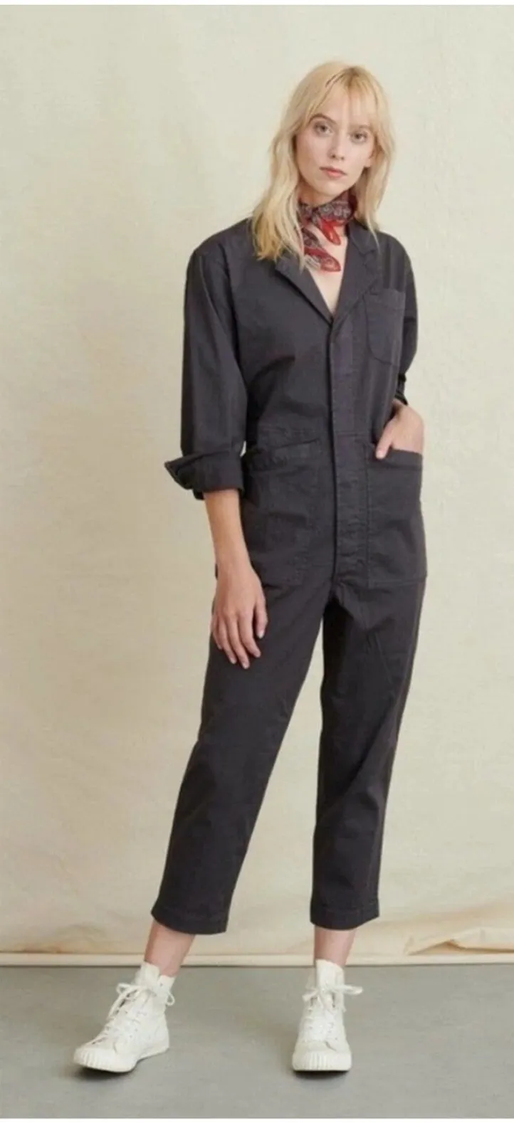 Work the weekend with utility style in this sturdy jumpsuit made from stretch-kissed cotton twill. Size: Large=10-12 Color: Iron Gray Approximate measurements laying flat: Length 54 1/2" Bust 42" Waist 17 1/2" across Inseam 26" Notched lapels Long sleeves 98% cotton, 2% elastane Machine wash, line dry Imported Condition: New without tags, extra button attached.