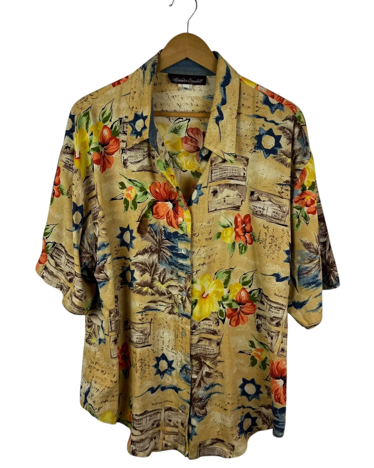 Good Pre-Owned Condition (see pics for details) Flaws: Has discoloration inside collar. Eye-catching vintage button-up shirt, boasting a vibrant floral and tropical-themed design. This short-sleeve top features a unique pattern with hibiscus flowers, palm trees, and architectural details reminiscent of a Hawaiian or island getaway. The soft, comfortable fabric drapes nicely, making it perfect for relaxed wear. This shirt is great for vacation getaways, casual outings, or adding a touch of tropical flair to your everyday wardrobe. Type: Button-Up Department: Women Style: Basic Material: Rayon Neckline: Collared Sleeve Length: Short Sleeve Sleeve Type: Classic/Fitted Sleeve Accents: Button Pattern: Floral Theme: Tropical, Hawaiian, Aloha, Beach, Vacation Features: Lightweight Fit: Regular Keywords: Alexander Campbell, vintage shirt, floral shirt, tropical shirt, aloha shirt, Hawaiian shirt, button up shirt, short sleeve shirt, womens shirt, rayon shirt, size 16, beach shirt, vacation shirt, palm tree shirt, Aloha Shirt, Vintage, Floral, Rayon, Button Up, Vacation, Resort Wear, Retro, Tropical, Island Style, Made in USA, Luau, Cruise, Summer, Travel, Tourist Shirt Measurements: included in photos. Please compare the measurements to something you already own for a great fit! Fast shipping: Shipped out next business day! Please let us know if you have any questions!