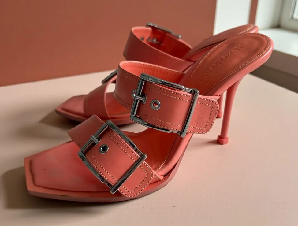 Elevate your style with these stunning Alexander McQueen Boxcar sandals. Featuring a chic coral peach hue, these leather buckle heels offer elegance and sophistication, perfect for any occasion. Great condition with some wear to interior from use only. 4" heel. • 100mm heel height • Coral peach leather • Buckle closure • Size 39 / US 9 • Luxurious design Condition:Great Pre-Owned Good Features: • Shoes Size: Womens 9