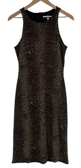 This sleeveless cocktail dress showcases a striking black and gold leopard pattern, ideal for a bold evening look. • Back zipper closure • Knee-length design • Fitted silhouette • High neckline • Fully lined Size: L Bust: 16 1/2" Length: 43 1/2" Fancy event dress 906