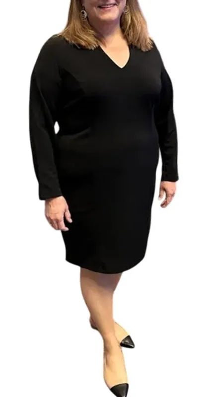 Size 2X Excellent, pre-owned condition. No flaws. Style D2691 Sheath dress V-neck Hits just above knee Long sleeves Solid black color Gold hardware Heavyweight 95% polyester, 5% spandex Stretch RETAIL $245 Tags: career, work wear, business casual, comfortable, comfy, plus size Bust: 23" Length: 41.5" Not sure if it will fit? Measure 1 or 2 of your favorite clothing items and compare. Measurements are approximate flat-lay.