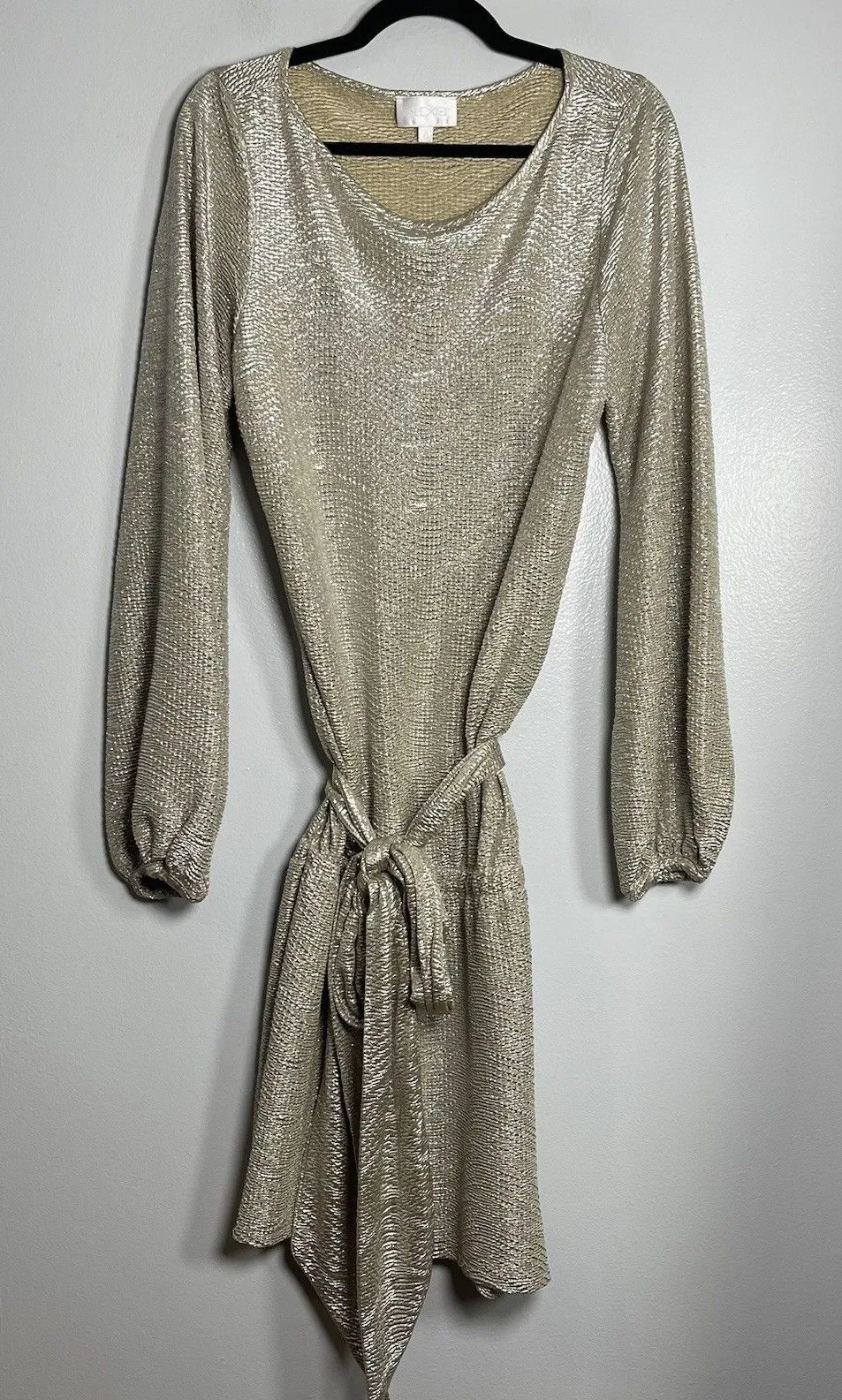 Very good preowned condition. There are no signs of stains or flaws. See actual pictures of item being sold. Measurements are approximate and may vary. The ALEXIS Crinkle Drop Waist Mini Dress is a stylish and festive choice for holiday parties or special occasions. Made in a luxurious gold color with a solid pattern, this dress features a tie closure and balloon sleeves for an elegant touch. The drop waist design adds a unique twist to the short mini style, making it a standout piece for any designer-loving wardrobe. Perfect for those looking for a designer holiday dress that exudes glamour and sophistication.