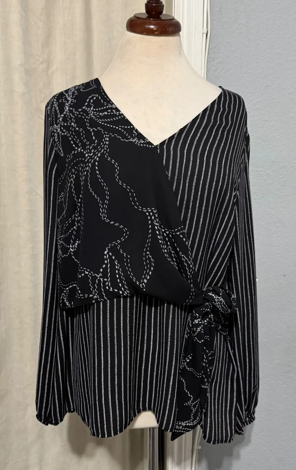 Alfani black and white wrap blouse with a striking chain print on one side and vertical stripes on t... Show more