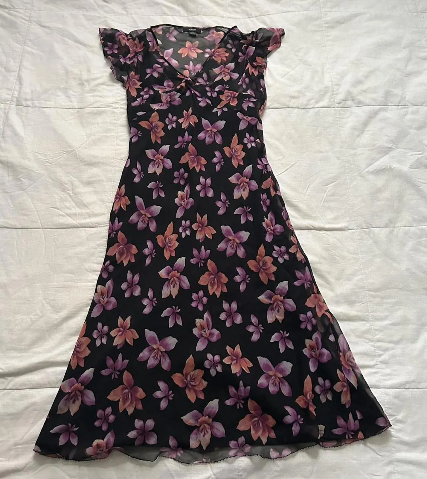 Alfani silk Whimsical purple pink and black floral midi dress with babydoll styling and flutter sleeves. Perfect for a wedding guest dress or to wear to a baby shower. Size 4 petite. some fraying at the back neck (pictured) with included slip. #fairycore #whimsygoth