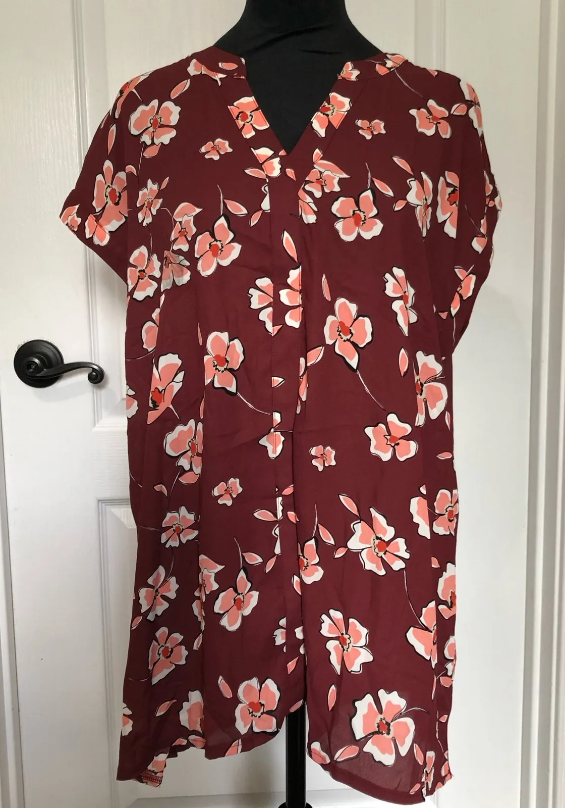 Alfani Women's Blouse Top Split Neck Short Sleeve Floral Maroon Size XL Condition:NWT Brand: Alfani Color: Maroon Size: XL Measurements laying flat (approximate): Length: 28.5 inches Chest (Pit to Pit): 23 inches Shoulder to Shoulder: 25.5 inches Materials: Rayon,Spandex All items are cross-posted Ships 1 to 3 business days after purchase Comes from a pet free/smoke free environment Please feel free to reach out to me if you have any questions.