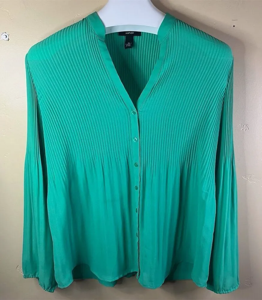Alfani Women's Long Sleeve Pleated Blouse Kelly Green Size 14 Career Work Wear This Alfani blouse in size 14 is a regular fit, designed for women. It features a solid green color with an elegant pleated design and a button-down front. Made from 100% polyester, it is lightweight and comfortable, with long sleeves. Suitable for both casual and formal occasions, this blouse is machine washable and manufactured in Indonesia. The item is pre-owned. Brand: Alfani Size: 14 Color: Green Type: Blouse Department: Women Style: Basic Material: 100% Polyester Sleeve length: Long Sleeve Pattern: Solid Features: Elegant pleated design, Button-down front, Lightweight and comfortable Country/region of manufacture: Indonesia Garment care: Machine Washable Measurements: Chest 20” Length 26” Great Condition. No Stains, Tears, Rips, Holes or Pilling. From a smoke free home and perfume free home. We carefully inspect each item for quality. Tags: Corporate, Work, Career Wear, Business, Business Casual, Interview, Job!Black Tie, Formal, Date Night, Cocktail, Wedding, Wedding Guest, Bridal, Shower, Show, Symphony, Play, Broadway