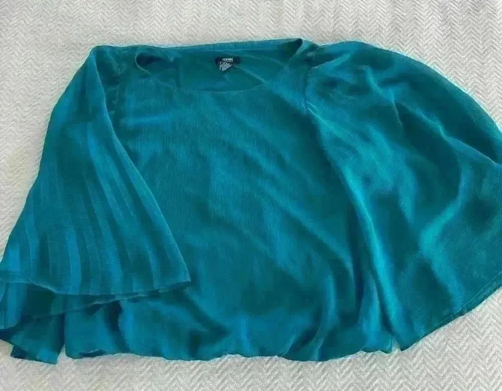 Fun in great condition teal top! Elastic bottom for a fitted look. Big flare sleeves. Round neck Brand: Alfani Size: 14P Color: Teal Materials: Polyester Measurements: 19in pit to pit 21in long All measurements are approximate I am a quick shipper usually next day and sometimes same day as purchase.