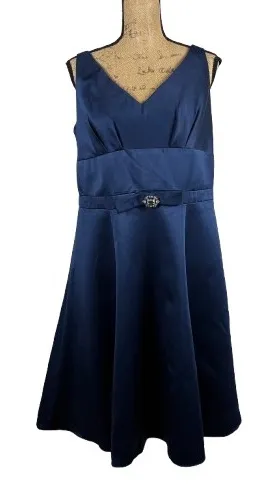 Condition: Good used condition with one side of the ribbon belt untacked - easily fixed before your event! Style: Fit & Flare, A-Line Dress Length: Knee Length Department: Women Sleeve Length: Sleeveless Pattern: Solid Occasion: Party/Cocktail, Formal Material: Polyester, Cotton Blend Fabric Type: Satin Neckline: V-Neck Season: Spring, Summer, Fall Closure: Zip Accents: Rhinestone, Bow Features: Lined Measurements (laid flat): - Bust: 19.5" - Waist: 18" - Length: 42" Keywords: homecoming dress, bridesmaid dress, formal, semiformal, evening wear, cocktail, special occasion, wedding guest, chic, elegant, event dress Thank you so much for shopping with me, and please let me know if you have any questions! Offers are always welcome. Bundle to save.