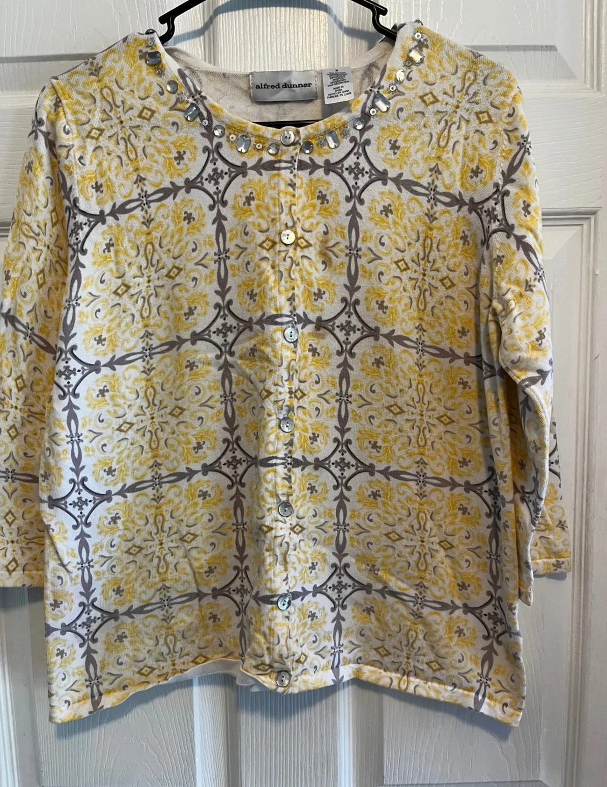 Elevate your everyday style with this charming Alfred Dunner cardigan. This delightful piece features a beautiful yellow and gray floral pattern that exudes a touch of vintage charm. The round neckline is adorned with shimmering embellishments, adding a hint of sparkle to your look. It has a classic button-down front and is perfect for adding a layer of warmth and style. Keywords: Alfred Dunner, cardigan, top, sweater, floral, yellow, gray, embellished, neckline, small, button down, classic, vintage, boho Thanks for Looking!