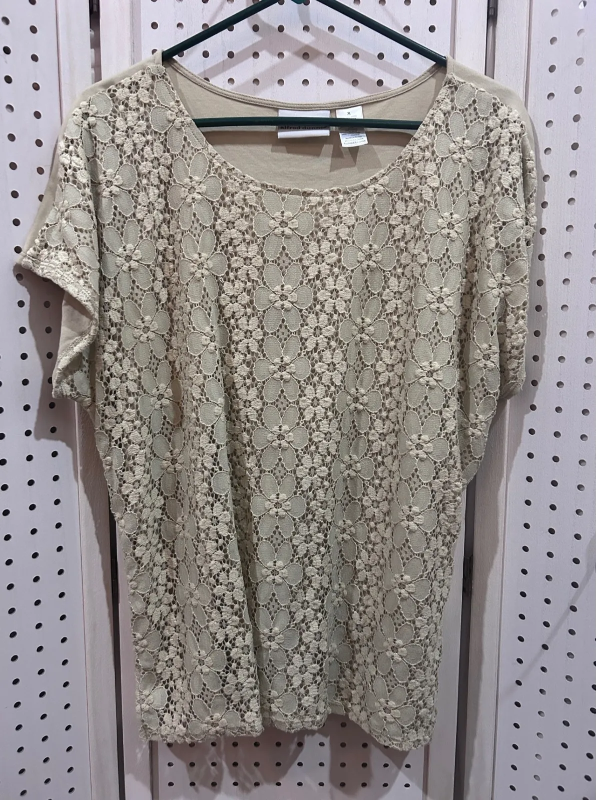 Alfred Dunner lace overlay top in beige. This elegant top features a delicate floral lace overlay on... Show more
