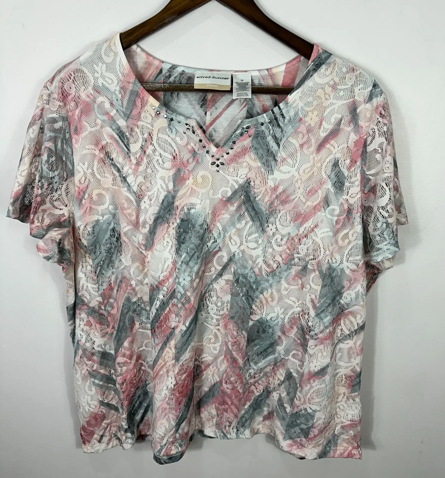 Alfred Dunner Top 1X Pink Gray Chevron Lace Knit Short Sleeve Pastel Boho Measurements (approx, flat lay): Pit to pit: 24.5" Length: 26.5" Features: * Soft stretch knit with attached lace overlay * Pink gray and white chevron print * Rhinestone neckline detail * Lightweight breathable fabric * Pullover style * Short flutter sleeves boho, pastel, romantic, mature, modest, Alfred Dunner woman, spring summer top, lace blouse, casual layering Fabric: 100% polyester shell 100% nylon lace