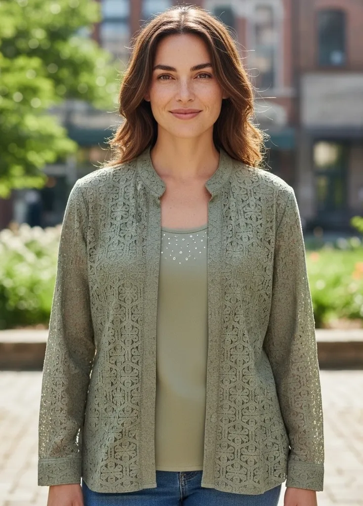 Elevate your ensemble with this sophisticated sage green lace blouse and tank top set. The intricate floral lace pattern brings an air of refined elegance, while the coordinating tank adds a touch of subtle shimmer with its beaded and sequined neckline. The open-front design and band collar offer a modern twist on a classic silhouette. Perfect for adding a layer of texture and visual interest to your outfit, this set is ideal for a garden party, a sophisticated dinner, or a special daytime event. Measurements: • Top Pit to Pit: 27" • Top Shoulder to Hem: 29" • Tank Pit to Pit: 25" • Tank Shoulder to Hem: 27" Color: Green Type: Blouse Department: Women Style: Tunic Material: Cotton Blend, Polyester Blend, Cotton, Nylon Neckline: Collared Sleeve Length: Long Sleeve Sleeve Type: Classic/Fitted Sleeve Accents: Beaded, Sequin Pattern: Floral Features: Layered, Lightweight, Open Front, Breathable, Collarless Keywords: Alfred Dunner, Woman, Sage Green, Lace, Blouse, Tank Top, Plus Size, 24W, Open Front, Bohemian, Floral Lace, Layering Piece, Casual, Dressy