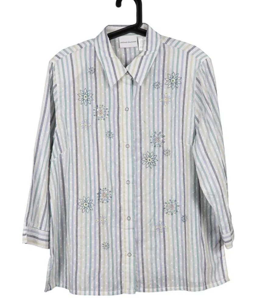 Size: Womens 16 Measurements are approximate and taken flat. Underarm to Underarm 22 in Sleeve Length 20 in Length 28 in There are no stains, tears, or rips. Please see the pictures. All pictures are of the actual item. Colors may vary slightly due to camera limitations and monitor settings. • 60% Cotton, 39% Polyester, 1% Metallic • Shoulder Pads • Machine Wash Pre-Owned Good