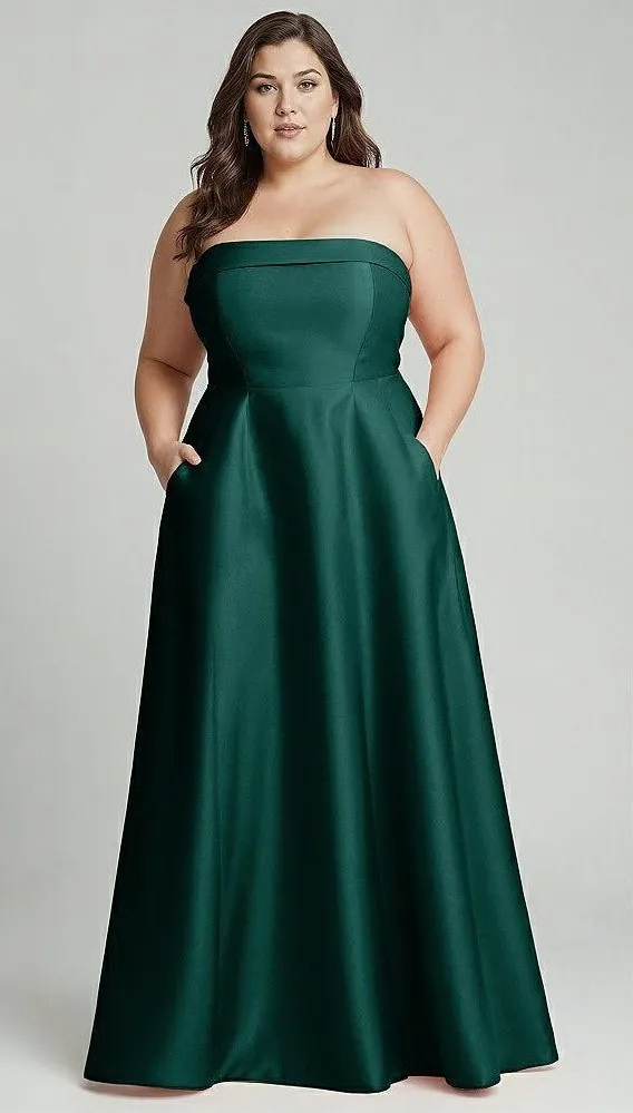 A floor-length strapless dress in a rich evergreen hue. This elegant gown features a structured bodi... Show more