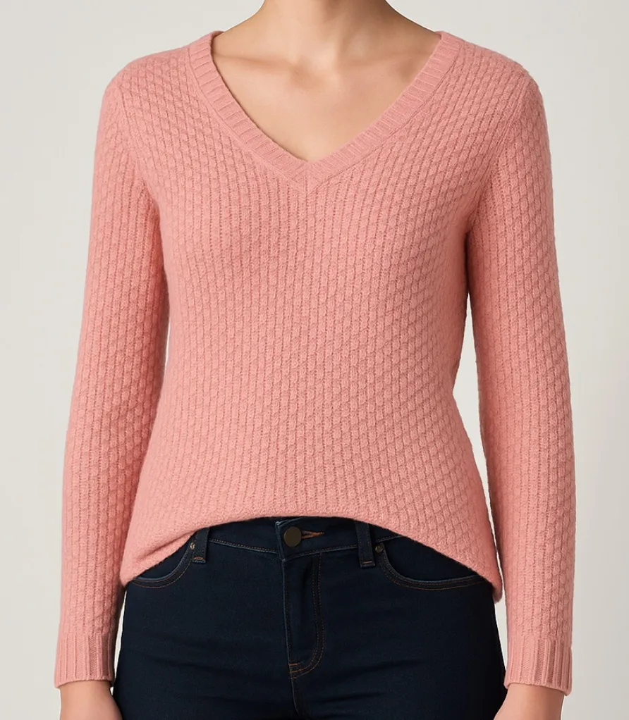Soft and cozy pink knit sweater by Algo Bonito, made in Spain. Textured weave with a flattering V-ne... Show more