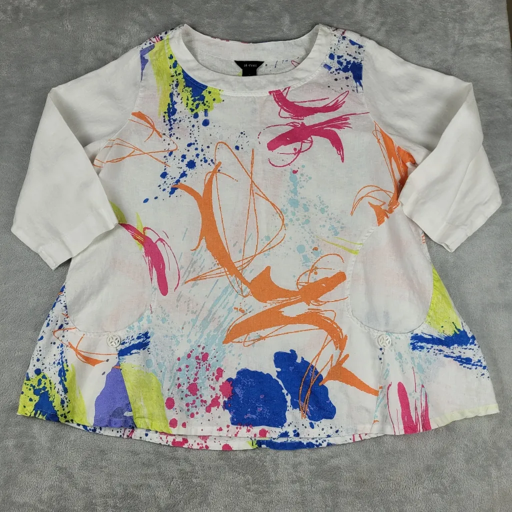 Ali Miles 100% Linen Women's Size 1X Paint Splash Tunic Top Pockets 3/4 Sleeve Pink - $38 - From Brand
