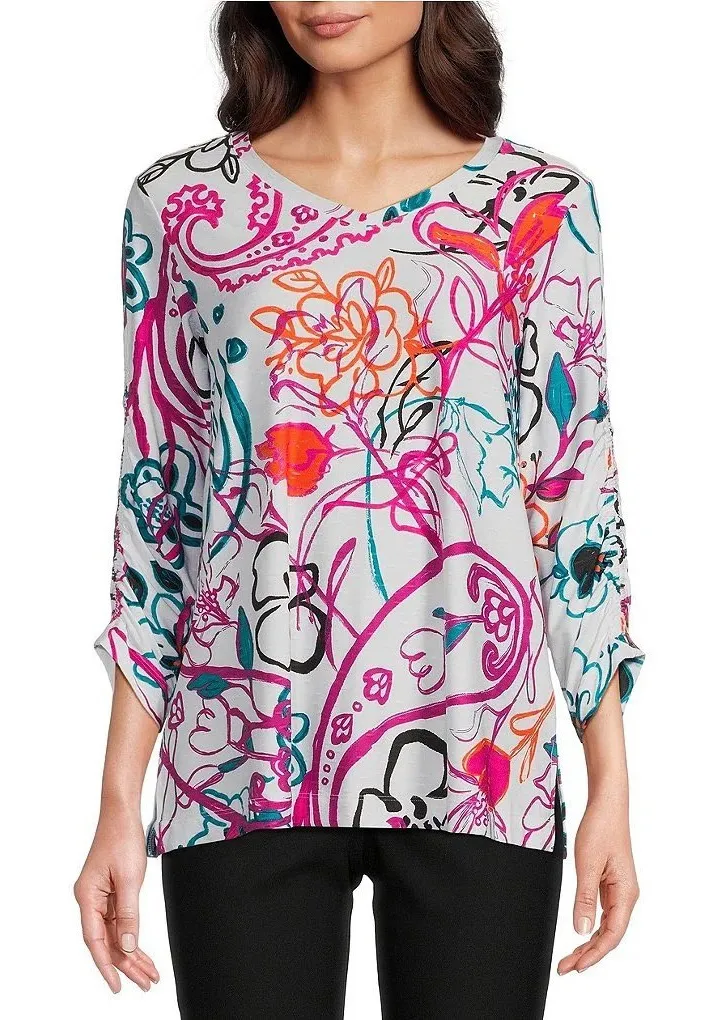 Ali Miles‎ Abstract Floral V-Neck 3/4 Cinch Sleeve Tunic White Pink Size Small - $28 - From STL