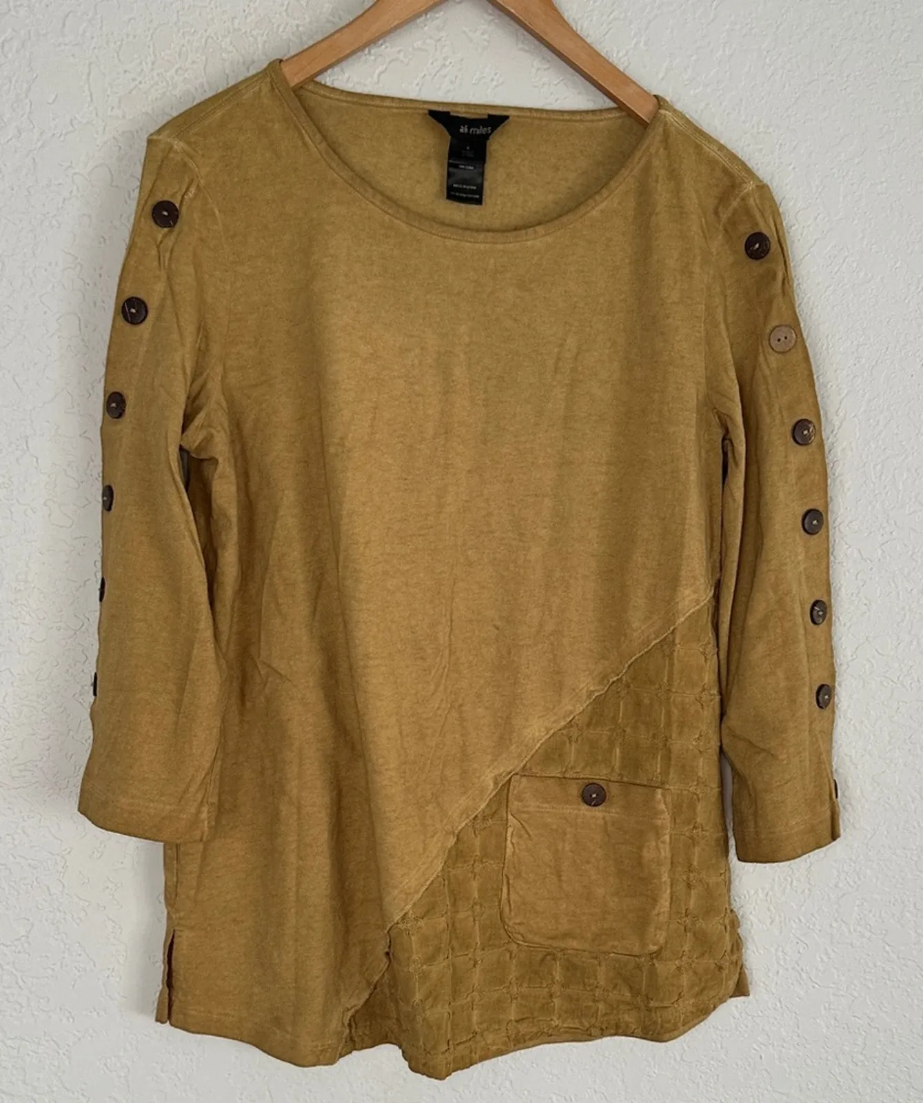 Ali Miles Button Sleeve Tunic Top Size small Olive Green 100% Cotton Casual top Pocket in front 3/4 length sleeve Decorative wooden buttons Textured asymmetric area near bottom Length approx 27.25” Slits on the sides Excellent like new condition! I ship fast B9