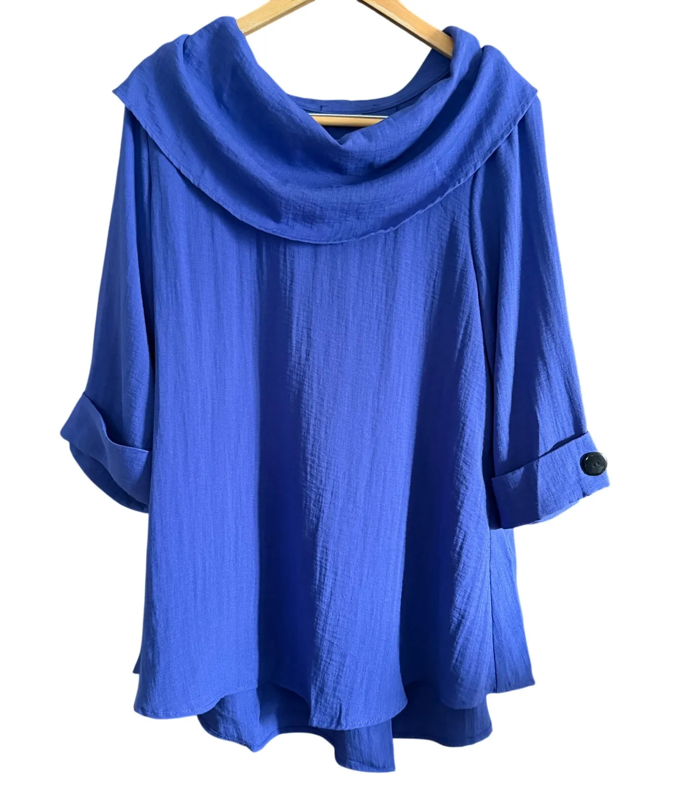 ALI MILES | Royal Purple / Blue Art to Wear Artsy Trapeze Shirt Flowy Gauze Rolled Cuffs with chunky Black Buttons (non-functional) Dramatic Cowl neck Trapeze Silhouette Interior tagging has been removed, otherwise in excellent condition - no flaws Women's Size Extra large Lay-flat measurements; Chest, Pit to pit: 23 inches Length, center back: 30 inches Boho, Bohemian, Festival, Beachy, coastal, Lagenlook, Art to wear, Artsy, Art Teacher