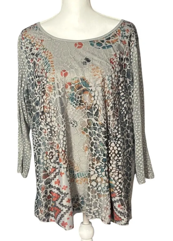 Round neckline Sheer sleeves Pullover styling 3/4 sleeves Lined Mix media layered fabric Multicolor All over animal/aztec print Stretch Length - 28" Across chest - 23" Ships from a smoke-free and pet-free environment Tunic is in excellent pre-owned condition without any blemishes Trusted seller; ships quickly Packaged with care Art, Art to wear, Artsy, Aztec, Bohemian, Boho Chic, Colorful, Lagenlook, Santa Fe, Southwestern, Wearable Art, Western