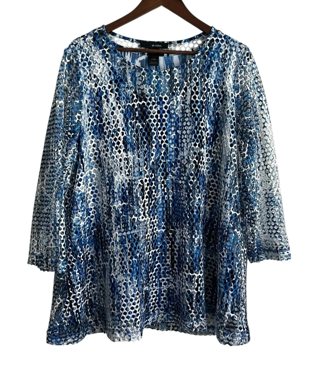 Ali Miles Womens 1X Blue Mesh Overlay Tunic Top Abstract Print Stretchy Layered Great Pre-Owned Condition - See Pictures for Details Details: (First picture truest color) • Textured mesh overlay with abstract blue and white pattern • Built-in cami lining with stretch for comfort • Flowy fit and breathable fabric perfect for layering • Unique artistic style with boutique appeal • Great piece for arts events, brunch, or casual office • shell: polyester; cami: polyester spandex blend, machine wash Style Profile: abstract mesh blouse, layered tunic top, artsy, textured, modern, statement piece, mature style, boutique casual, wear to a weekend art show, layered over jeans or dress pants for an upscale casual vibe Approximate Measurements: flat lay: armpit to armpit: 24“ length: 29“ Pet/ smoke free home 1-2 day shipping Bundle & Save
