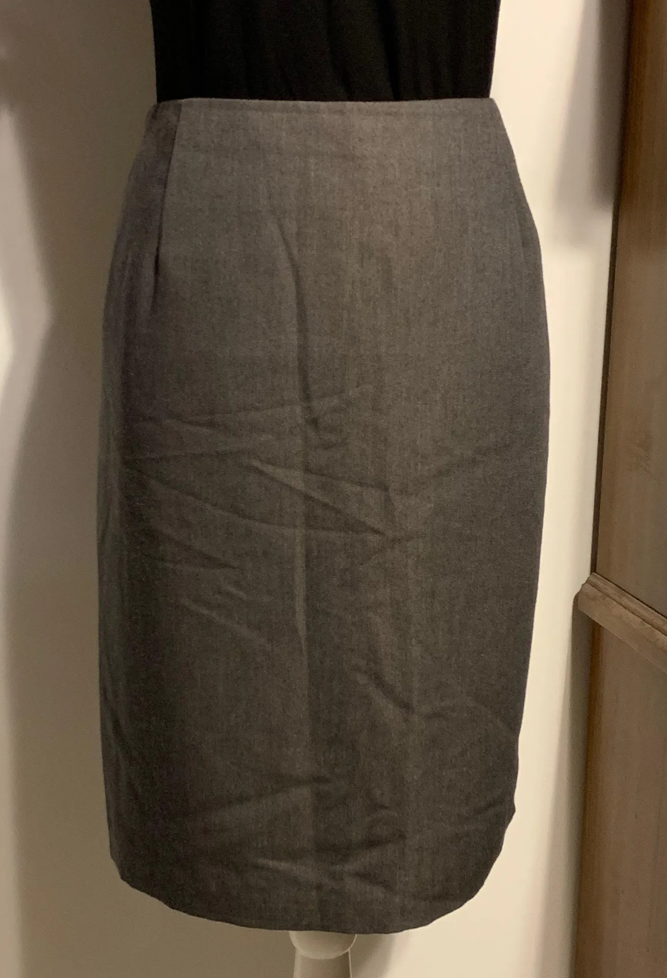 Invisible Back zipper closure, slit in the back, lined, fitted, no stretch, about knee or above knee length, polyester rayon blend, machine washable Measurements are: 16 1/2 inches flat waist (33) 22 inches flat hip approximately 22 1/2 inches from waist to hem Inventory skirt box