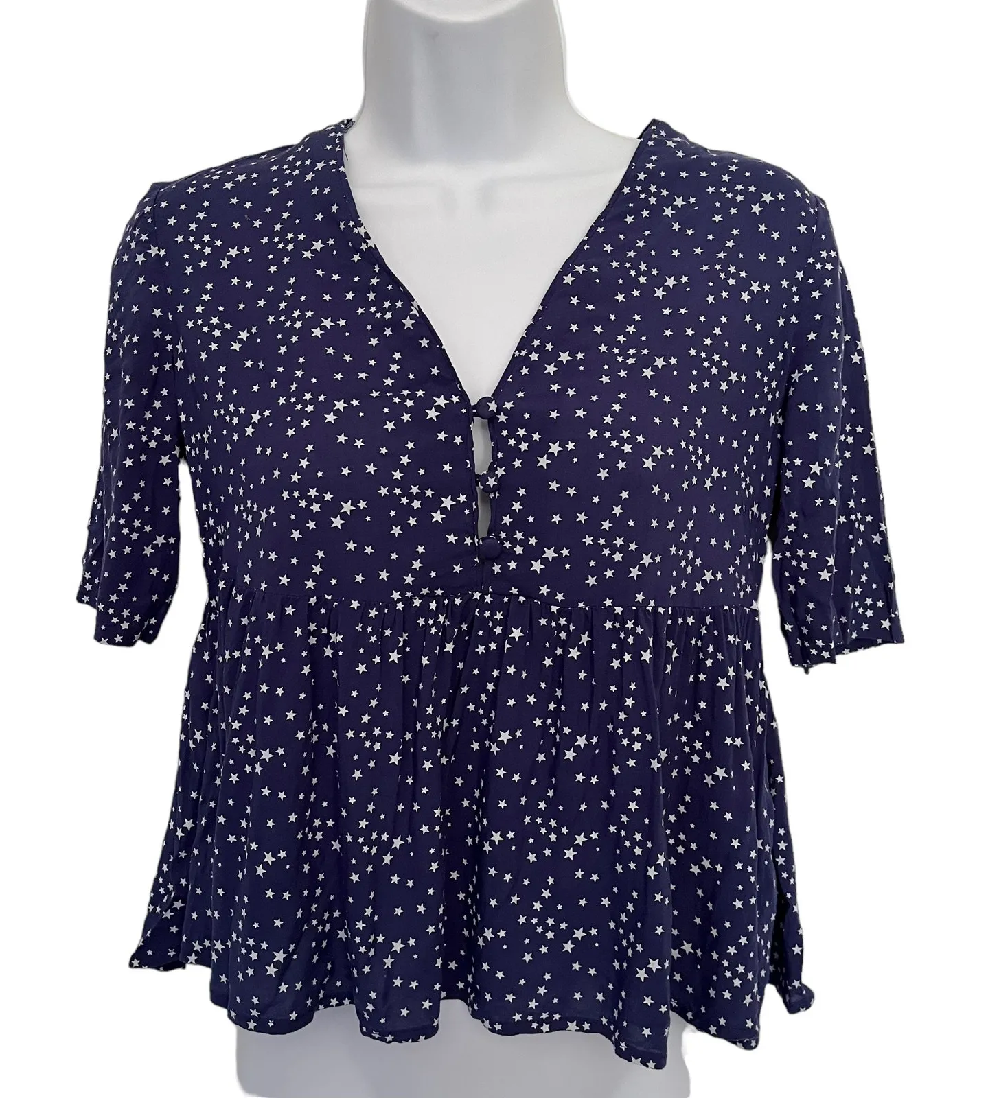 Blue Alice & Uo Star Print Rayon Peplum Top Celestial Mystic Whimsigoth Elbow Short Sleeves 3 Fabric button closure, v-neck Good pre-owned condition, please see photos Size XS 100% Rayon Approximate measurements: Pit to pit: 17" Shoulder to hem: 20" Sleeve length (from Underarm) 5.5" whimsigoth inspired, celestial top, star print blouse, babydoll top, romantic boho, mystic aesthetic, soft goth, peplum blouse, navy star top, cottage celestial, Americana