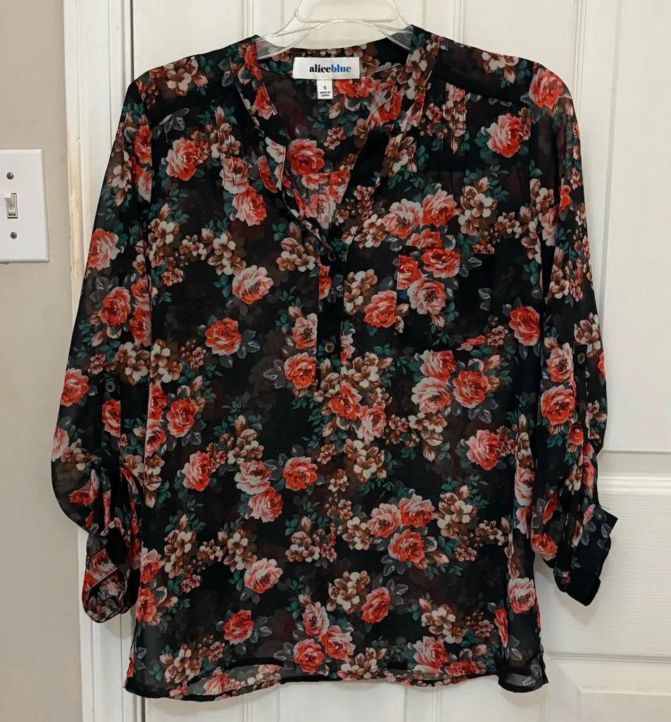 EUC, no stains, holes, or obvious signs of wear. Women’s size small from Alice Blue brand. Black with pink and green floral pattern on sheer material with single front pocket, 2 buttons at chest, and 3/4 tab roll sleeve with button cuff. 100% polyester. Pit to pit: approx 19.5” Shoulder to hem: approx 26”