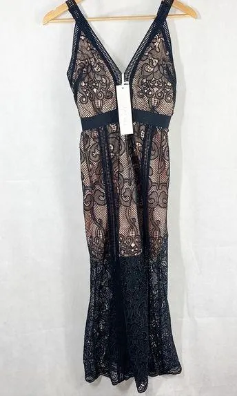 Alice McCall Wanderlust Black lace sleeveless midi dress in size US4. New with tags, no flaws. This stunning dress is crafted out of black floral and leaf guipure lace that veils the body beautifully with a plunging V neckline and cinched waist, this midi length style is super feminine and flattering. The nude lining highlights the gorgeous pattern that frames and slims the figure. This dress features beautiful and intricate lace pattern with eyelet trim, adjustable straps, sleeveless with V neck, concealed back zip. Measurements are approximates only. Waist 25” hip 33” length 48” bust 28”