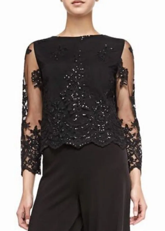 Alice and Olivia Ava sheer lace sleeve embroidered sequined top Lined Dressy and elegant... Show more