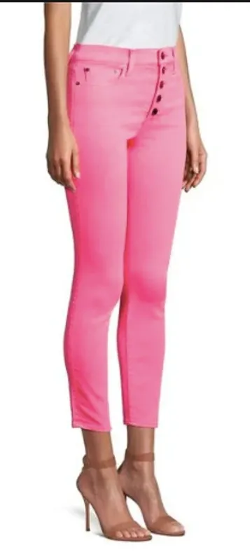 Vibrant hot pink high rise skinny jeans. These eye-catching denim pants feature an exposed button fl... Show more